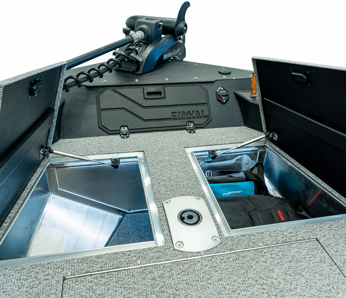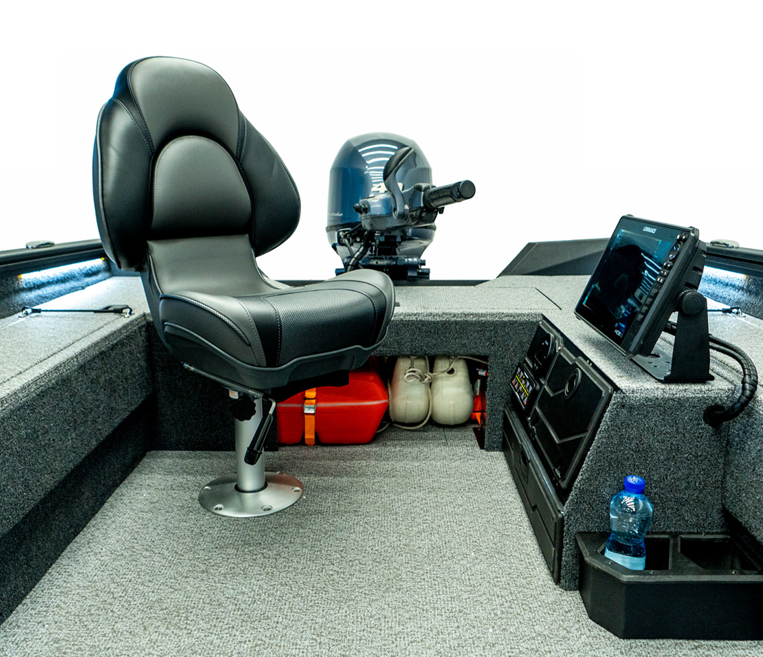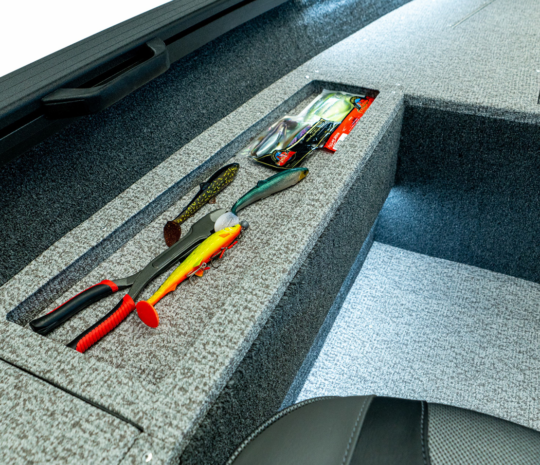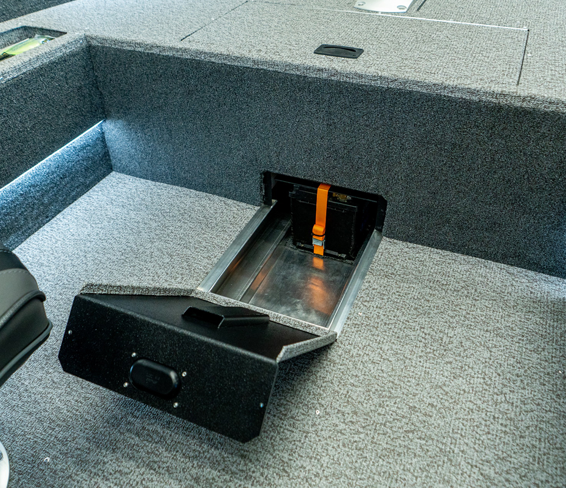 The front platform has factory space for the electric motor battery and charger, two organizers for the launches and two completely dry compartments.