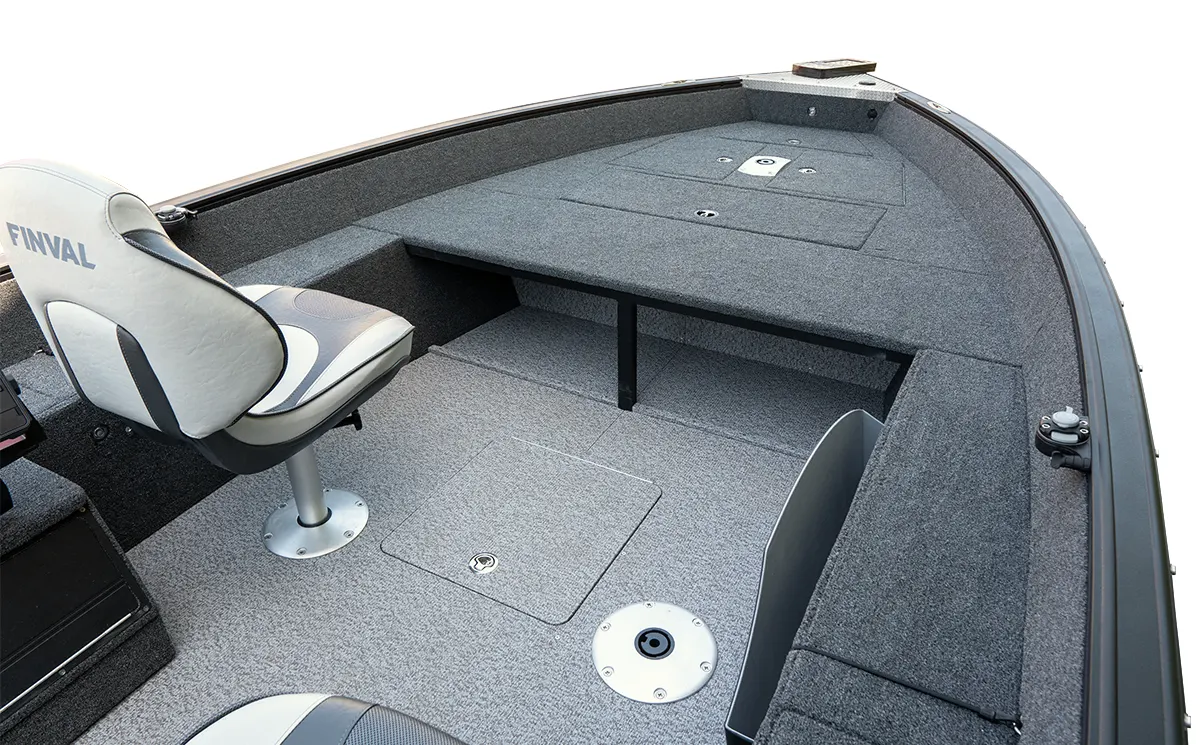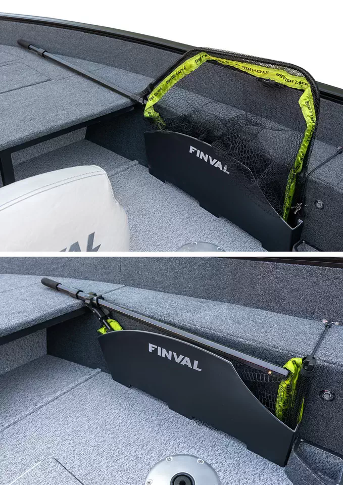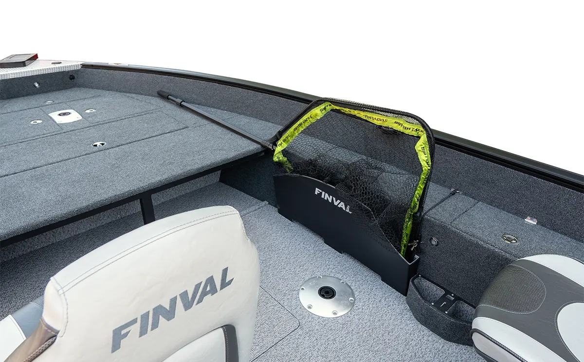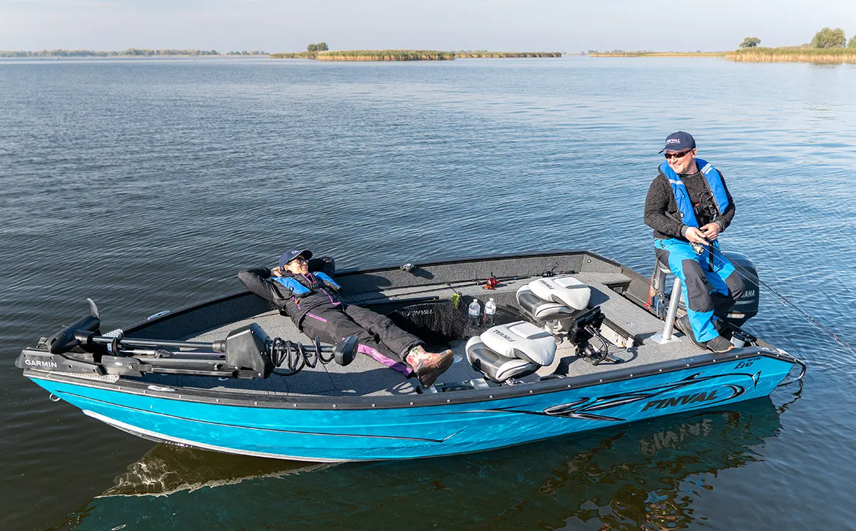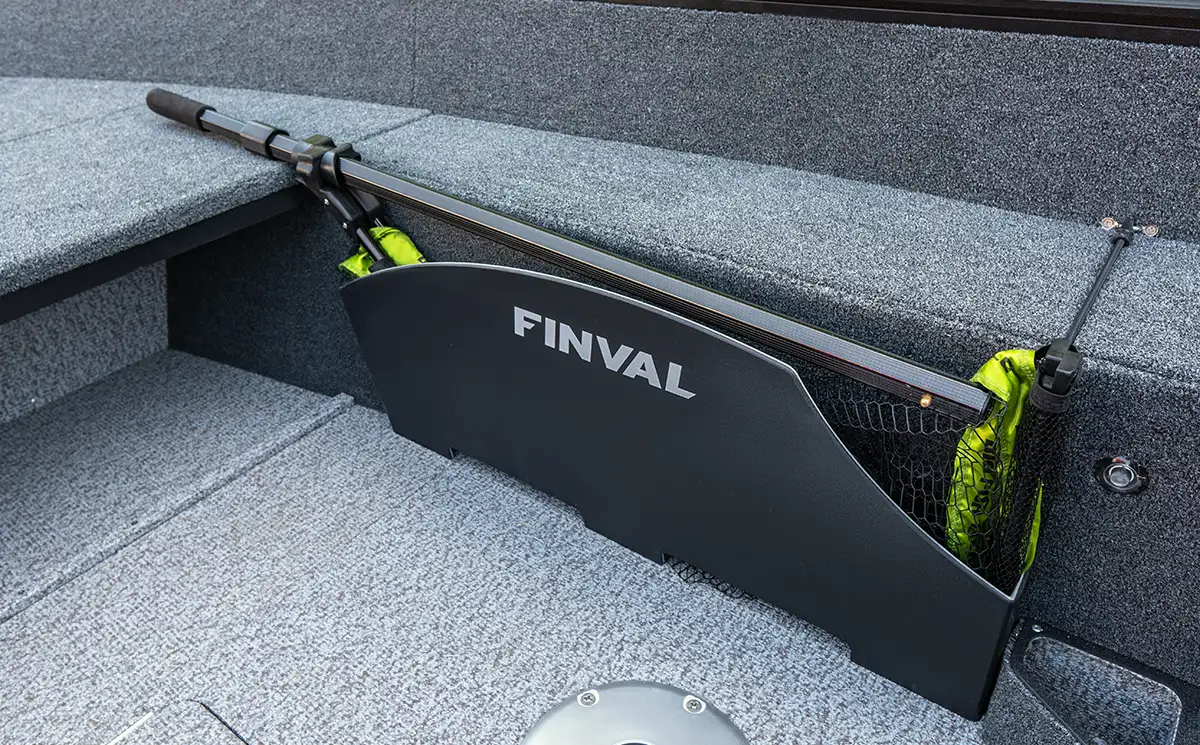 Finval 475 Evo Tiller is well equipped for trolling and vertical fishing. The width of 212 cm with a length of 472 cm makes is an absolute record among boats of this size that ensures maximum space and stability. Two echo sounders with a screen diagonal of 12’’ and more can be easily mounted on the driver console. The large glove boxes in the driver console have plenty of space for boxes with your favorite baits. Organizers for fishing tackle, cup holders, and rod holders can be placed anywhere you want. And all this at arm’s length. If you are looking for a spacious boat up to five meters long and want to fish with maximum comfort, Finval 475 Evo Tiller is an ideal option.