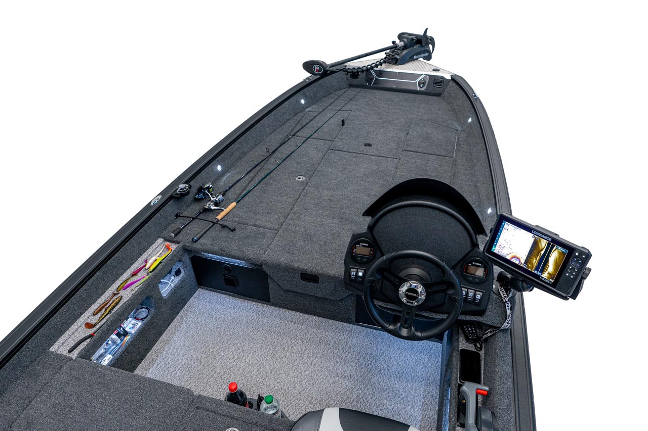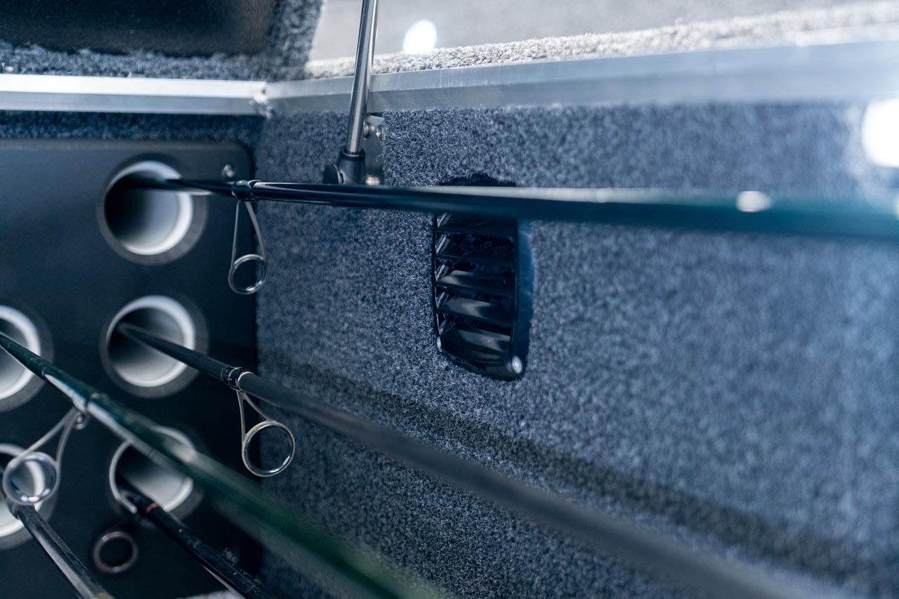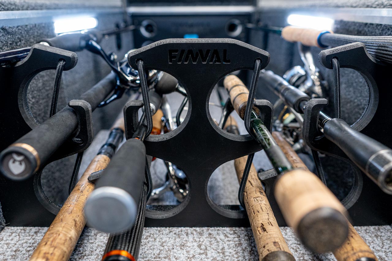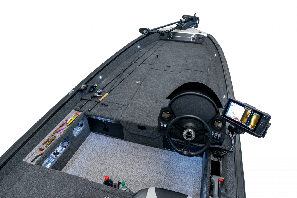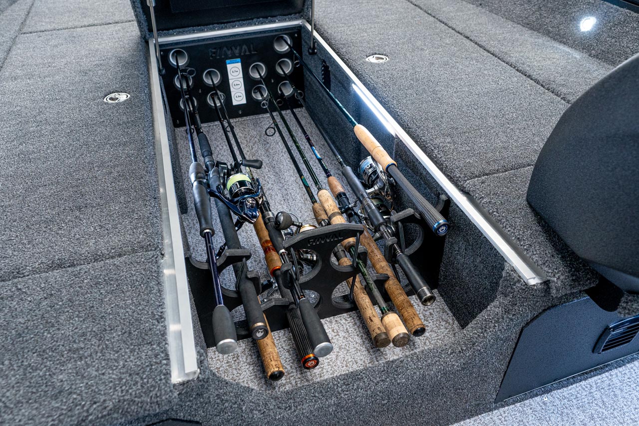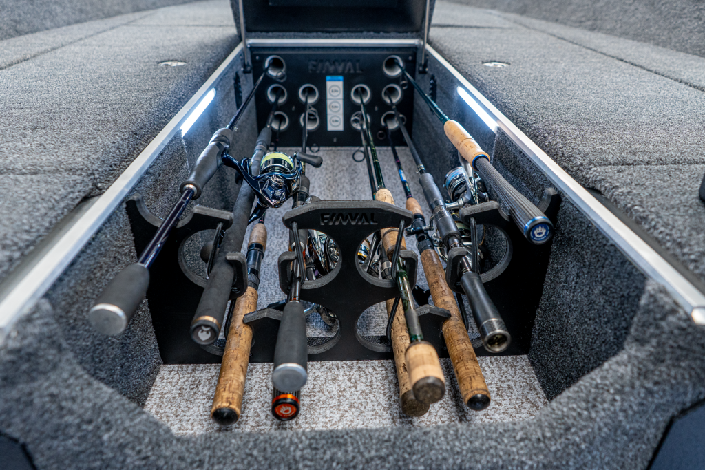 The Finval Rangy 510 BSC, an aluminium fishing boat, is meticulously engineered for skilled anglers. This five-meter aluminium boat boasts an impressive capacity for securely accommodating up to ten spinning rods, each extending up to 2.7 meters in length. Its design, reminiscent of traditional bass boats, features aft placement of the livewell and a generously sized bow deck.