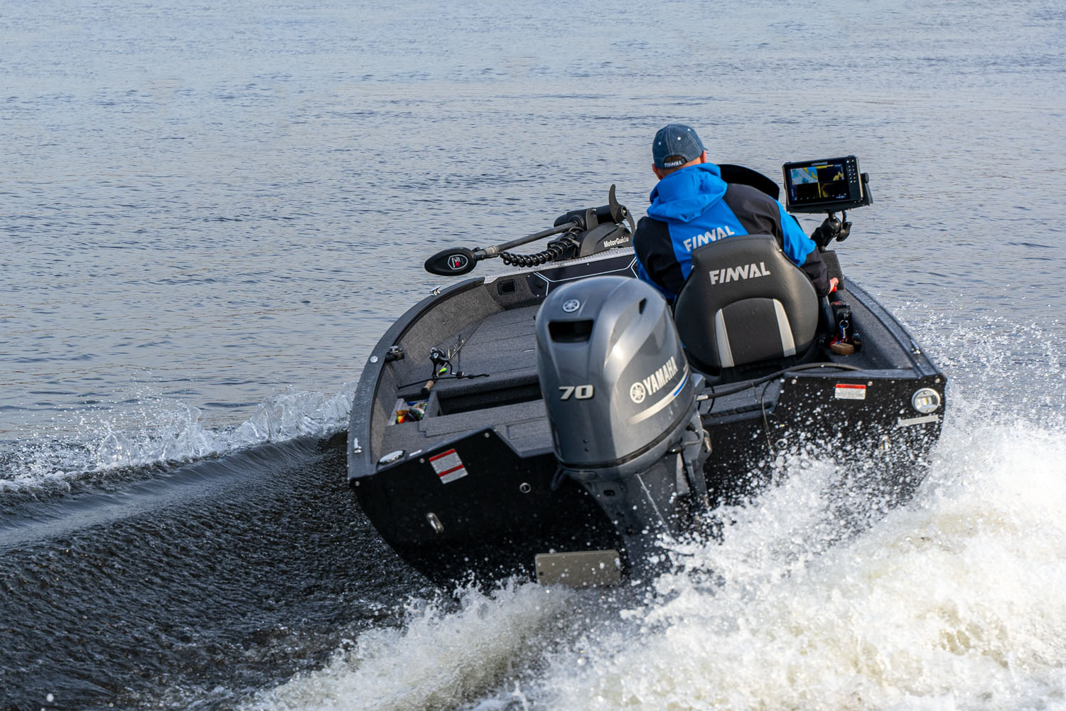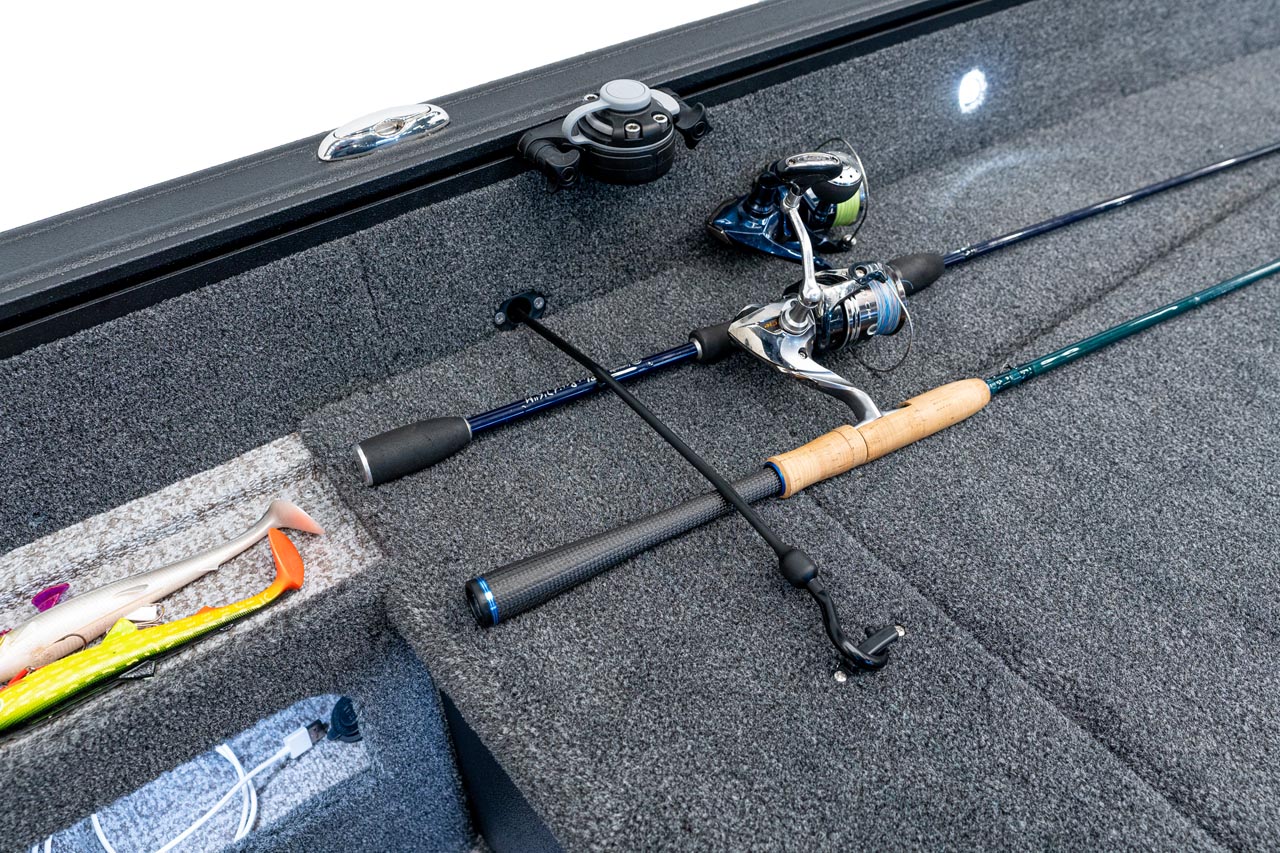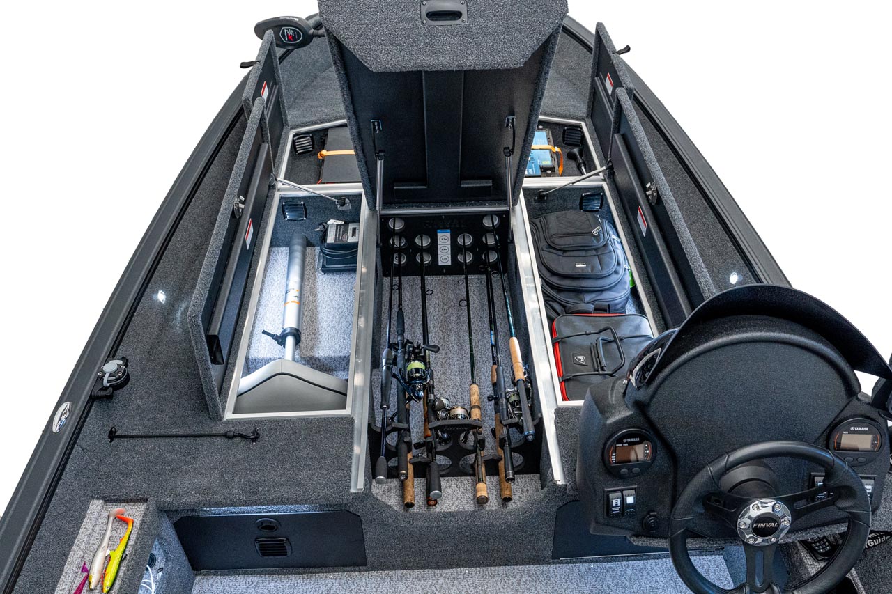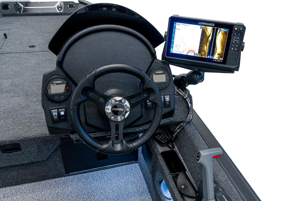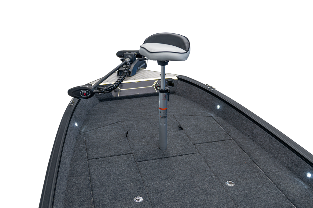 The Finval Rangy 510 BSC, an aluminium fishing boat, is meticulously engineered for skilled anglers. This five-meter aluminium boat boasts an impressive capacity for securely accommodating up to ten spinning rods, each extending up to 2.7 meters in length. Its design, reminiscent of traditional bass boats, features aft placement of the livewell and a generously sized bow deck.