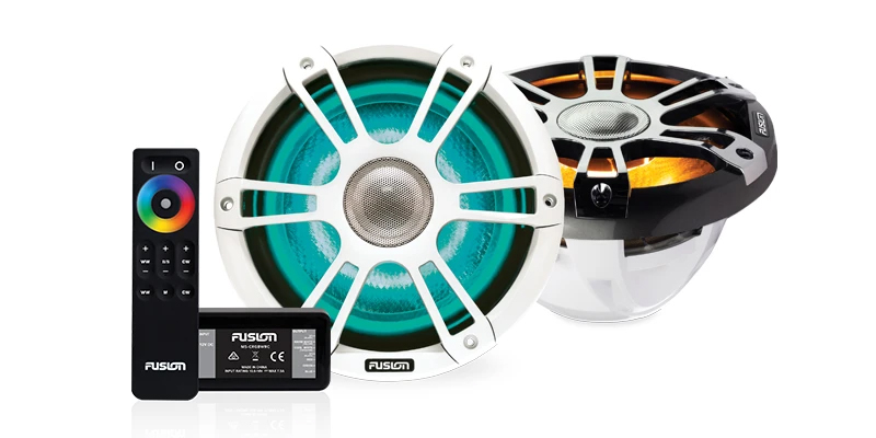 • Experience industry-first marine speakers with CRGBW LED lighting1