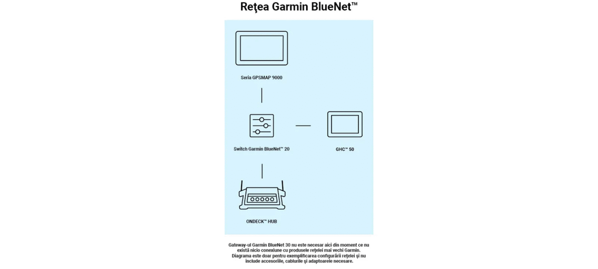 Măreşte numărul de porturi de reţea disponibile într-o reţea Garmin BlueNet™. După ce ai folosit toate porturile de pe chartplotterul compatibil, adaugă un switch Garmin BlueNet 20 la configuraţie şi continuă să-ţi dezvolţi reţeaua extinsă de mare viteză.